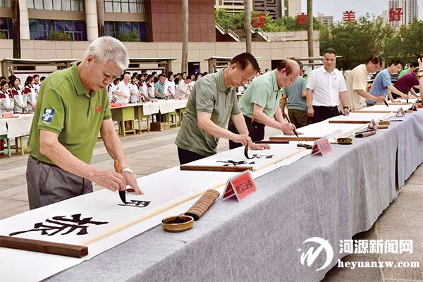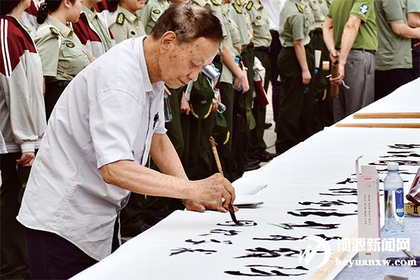 本报讯 记者 李馨 4月14日,广州大学附属东江中学内军歌嘹亮、墨香四溢。“求学报国骐骥驰骋国安铸魂育英才——2026国防教育暨书法艺术进校园百米长卷主题活动”在此举行。本次活动由河源市退役军人事务局指导,河源市爱国拥军促进会主办,广州大学附属东江中学承办,河源市禁毒协会协办,战斗英雄、书法家及师生代表齐聚一堂,以歌声致敬英雄本色,以笔墨书写家国情怀。