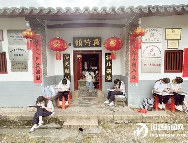 前日,来自佛山市岭南美术实验中学的120余名学子走进中国传统村落、广东省古村落——和平县热水镇兴隆民俗村,以画笔为媒,开启一场以古村为课堂的艺术研学之旅。兴隆民俗村以客家围龙屋为核心建筑特色,方圆相依的格局承载着千年客家文脉,其保存完好的古村落风貌为学子提供了鲜活创作素材,也让古村文化在青春笔触中得到活化与传播。活动现场,不少学子或分散在古村巷道、围龙屋群等点位,或蹲坐石阶细描建筑纹理,在乡土文脉中汲取创作灵感,以青春视角记录古村之美。