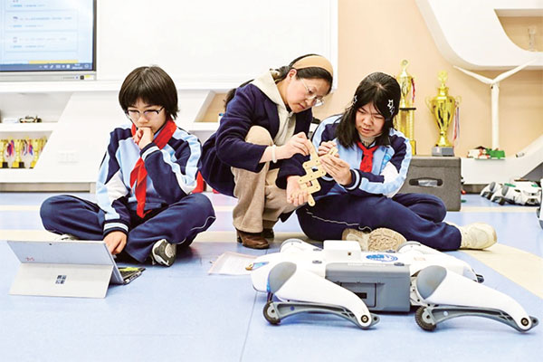 2025年12月2日,杭州市保俶塔实验学校的学生们在人工智能通识课上学习如何给机器狗编程。