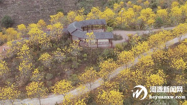 紫金客茶谷5000余株黄花风铃木吸引了不少游客。